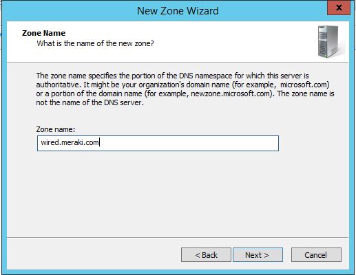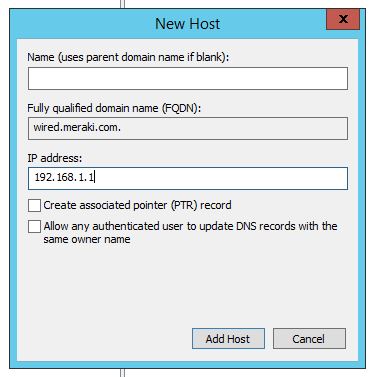 1) Create a forward lookup zone called “wired.meraki.com”   — NOT MERAKI.COM  if you do this you will prevent your devices from contacting the Meraki Cloud Controller.
