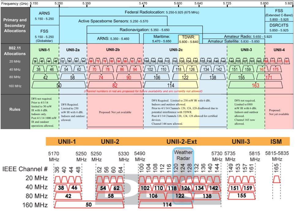 If we discuss 20mhz channels, UNII-1 channels 36-48 are POWER LIMITED by the FCC because of all the users in that band. For indoor applications you are limited to 17 DBI or only 50mw Ouch!
