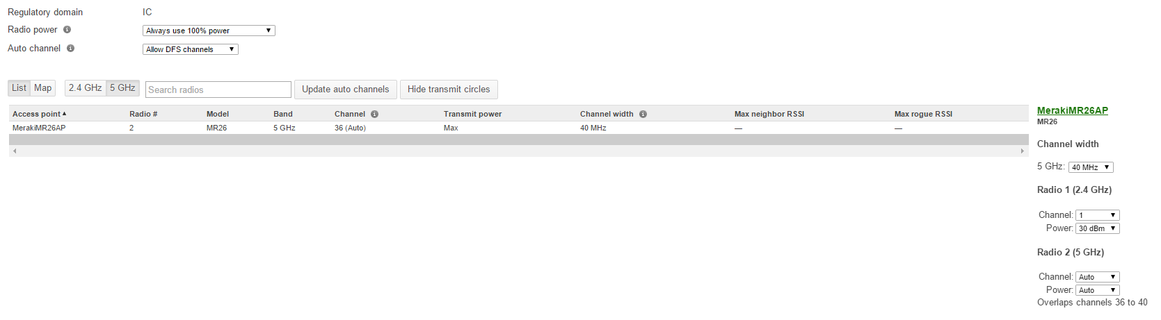 Why would the dashboard choose these low power channels by default? You would think they would start at least in the band that allows 24Dbm, or even the higher channels that support 30DBm – especially if I specified always use 100% power, you would think it would chose the channels where it can run higher power. Instead by default it chose the lowest power channel option.