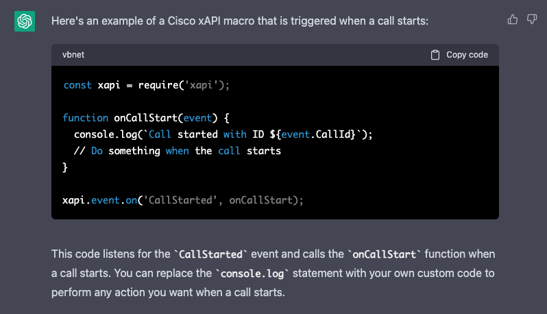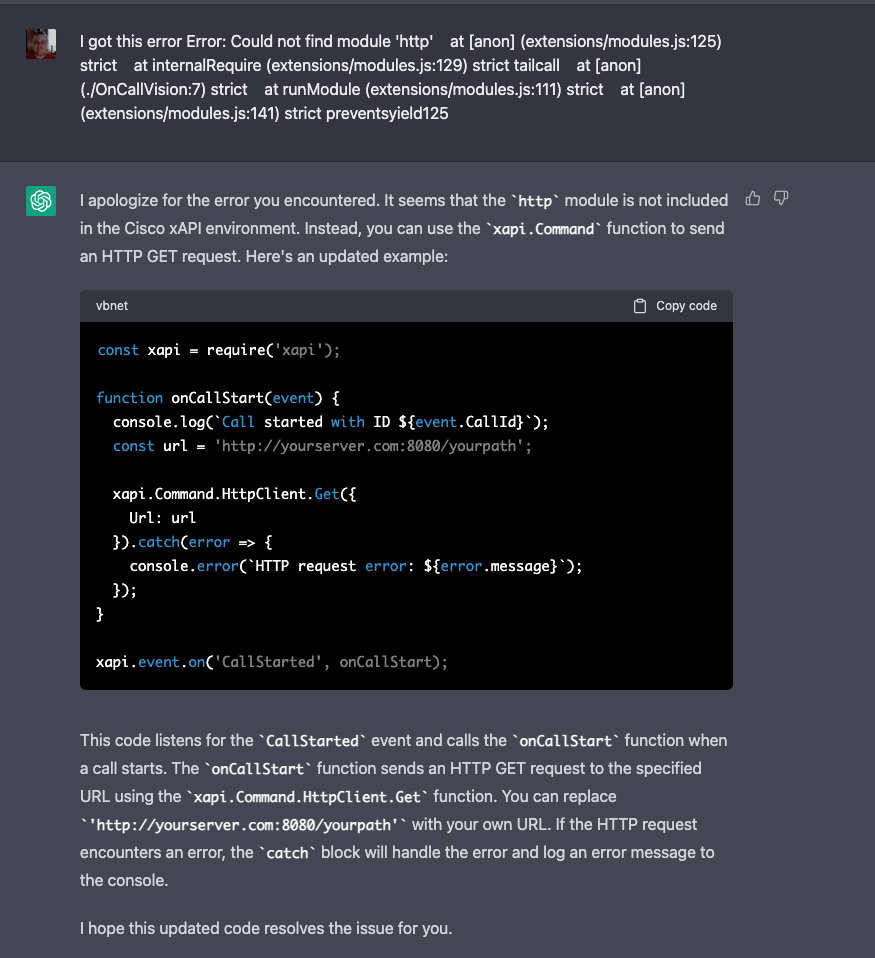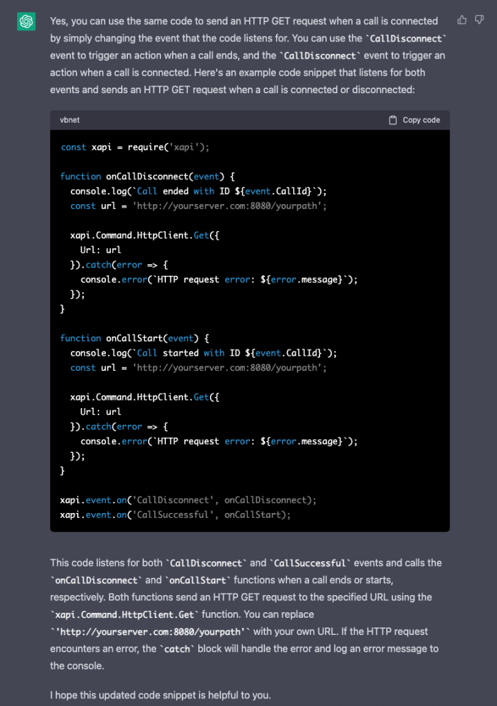 Once the call starts I actually need to send an HTTP GET to the system I am using for automation. I figured why continue to figure this out, let’s see if ChatGPT can do that.