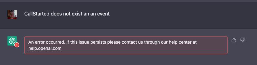 I finally was able to get ChatGPT to work again, and I was able to say “CallStarted” doesn’t exist. I was able to get this response, which is correct. This code – works.