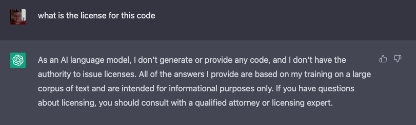 I decided to ask ChatGPT about the license. The response was interesting. “I don’t generate code” I think that is arguable.